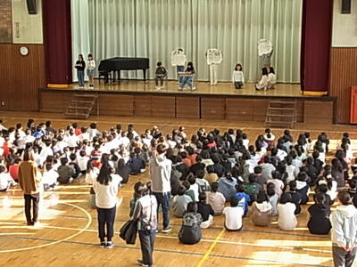また「6年生を送る会」については、スローガンの発表がありました。スローガンは「中学校でも前へすすんでがんばって。三ケ島小は全員味方。」です。6年生を送る会に向けての取り組みもいよいよ始まります。