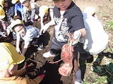 【1年生芋ほり】 投稿: 三ケ島小学校 (14:30) 1年生が「むくろじのうえん」に植えたサツマイモが収穫の時期を迎えました。そして昨日は、地域の方々にご協力いただいて、お芋ほりを行いました。 大きくて立派なサツマイモがたくさん採れて、子どもたちも大喜びでした!! これまで、いつも気にかけ育ててくださった地域の皆様、本当にありがとうございました!(*^-^*)