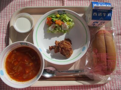 ミネストローネの中には、星やアルファベットのパスタが隠れています。探して楽しんでしました。