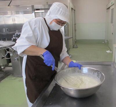 キャラメルプリンの生クリームを泡立てています。とろりと泡立てて、プリンの上にのせました。