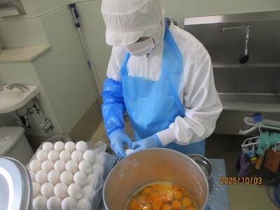 この作業は、専用の使い捨てエプロンをして、殻が入らないように卵の状態が良いかどうか確認しながら割卵します。下処理室で行い、次の作業に行くときには調理着も着替えます。