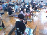 写真の場面は、「気持ちを合わせて、きき合いながら演そうしよう」というめあてで「ルパン三世のテーマ」をリコーダーや鍵盤ハーモニカで演奏練習している様子です。