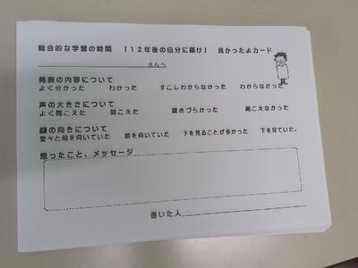 「12年後の自分に届け」と題して、自分が将来、就きたい職業について調べ、その仕事内容や遣り甲斐、今の自分にできることなど、プレゼンテーションソフトを活用して聞き手に分かりやすく発表していました!!